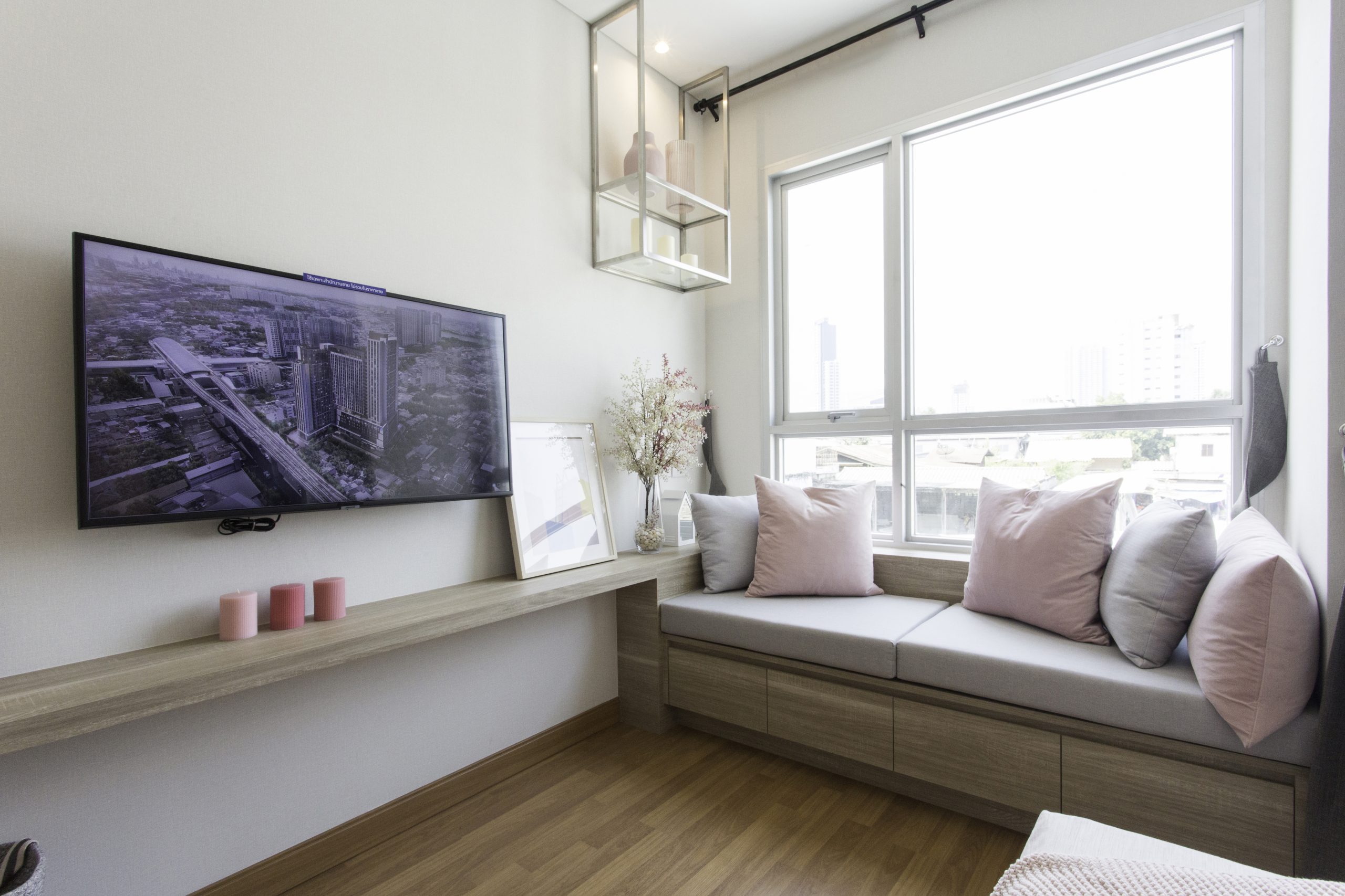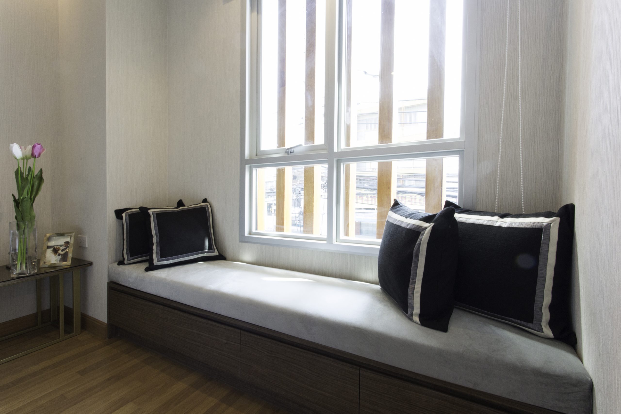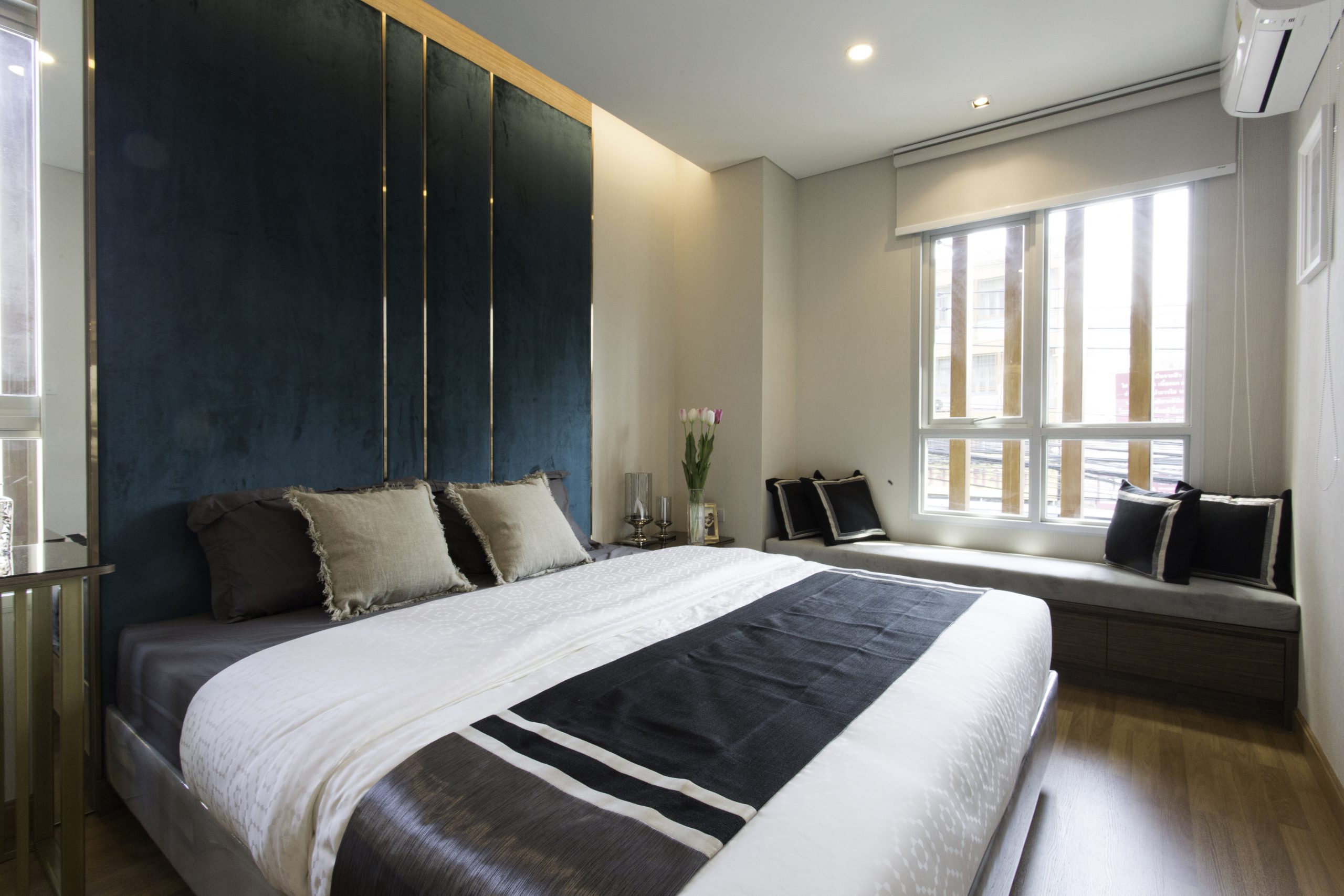 ส่วนห้องขนาด 1 ห้องนอน 28 ตรม. โดยส่วนตัวชอบฟังก์ชั่น และการตกแต่งของห้องตัวอย่างที่ทำให้ห้องดูกว้างขึ้น และยังมี Bay Window สำหรับนั่งพักผ่อนชิลๆ ริมหน้าต่างได้อย่างสบายอารมณ์ ห้อง Type นี้จริงๆ เหมาะกับการอยู่ 2 คนแบบสบายๆ แต่ถ้าเป็นครอบครัว พ่อ แม่ และลูกตัวน้อยๆ อีกสักคนก็พอเอาอยู่