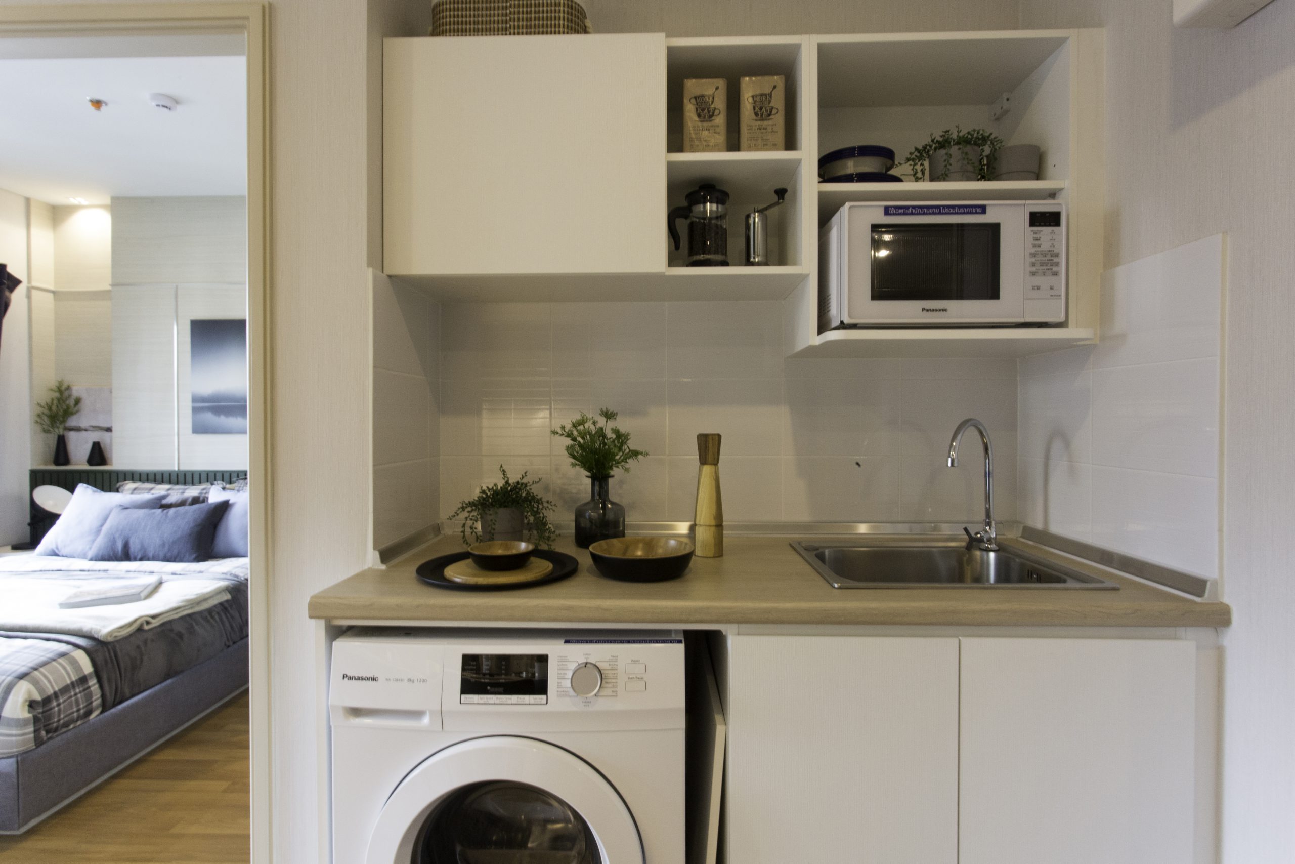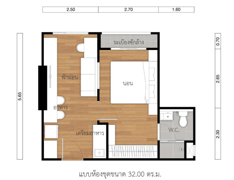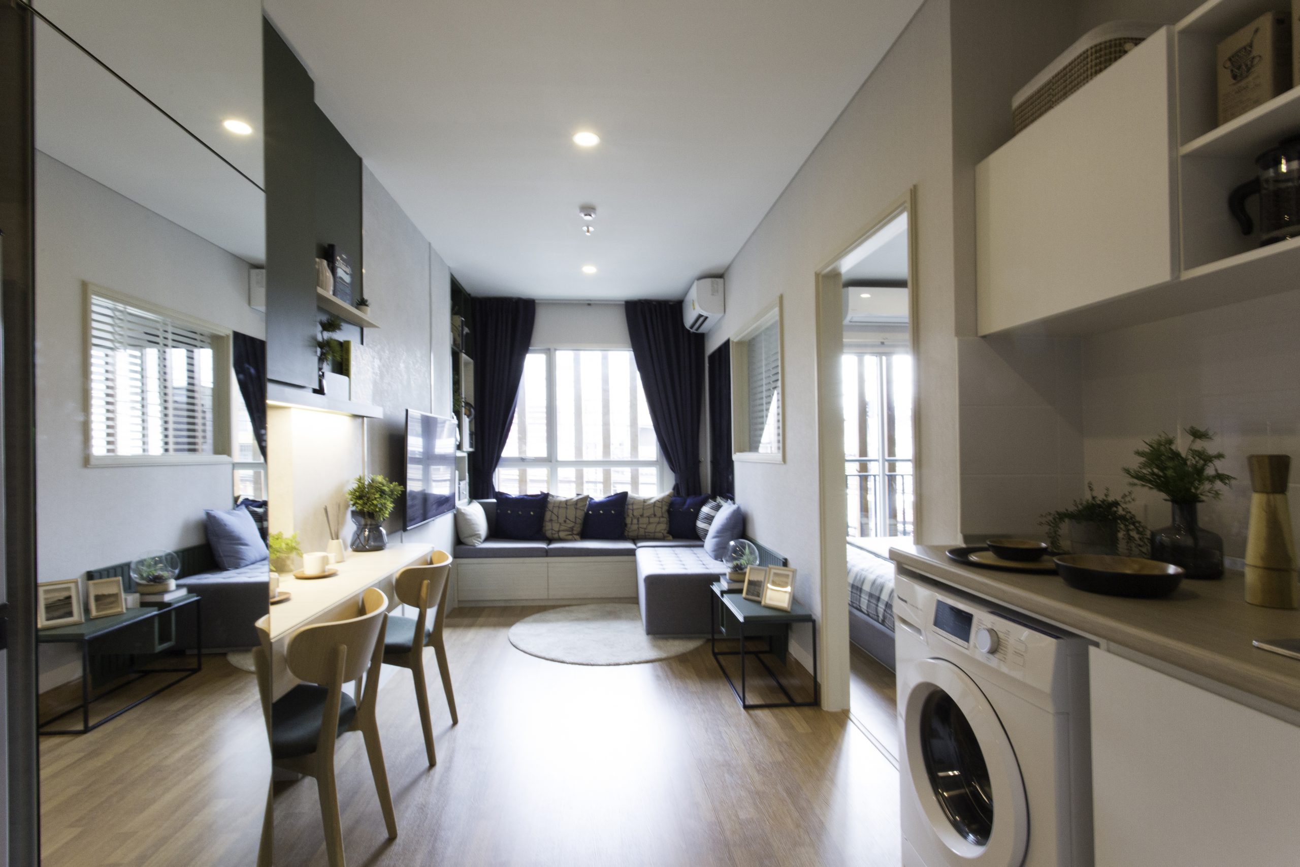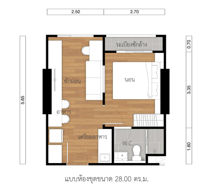 โครงการได้ออกแบบให้พื้นที่เตรียมอาหารและห้องน้ำอยู่โซนด้านหน้า และจัดพื้นที่พักผ่อนและห้องนอนเอาไว้ด้านในของห้อง เพื่อเชื่อมต่อกับภายนอก โดยสามารถจัดเป็นพื้นที่นั่งเล่นริมหน้าต่างในแบบ Bay Window ให้สามารถชมวิวทิวทัศน์ได้อย่างเต็มตา