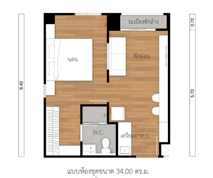 แต่ที่เหมาะกับการอยู่แบบครอบครัวคงต้องเป็นห้อง 1 ห้องนอน พื้นที่ 34 ตร.ม. พื้นที่กว้างขึ้นอยู่กันแบบครองครัวเล็กๆ ได้กำลังดีสามารถจัดพื้นที่นั่งเล่น พื้นที่ทานอาหาร ได้อย่างเป็นสัดเป็นส่วน ห้อง Type นี้ มีความพิเศษสำคัญคุณผู้หญิงตรงที่สามารถจัด Walk In Closet ตรงพื้นที่ว่างหน้าห้องน้ำที่อยู่ภายในห้องนอนได้อย่างลงตัว และพื้นที่ตรงหน้าต่างในห้องนอนยังจัดเป็น Bay Window ส่วนตัวสำหรับนั่งเล่น นั่งทำงานได้ตามอัธยาศัย