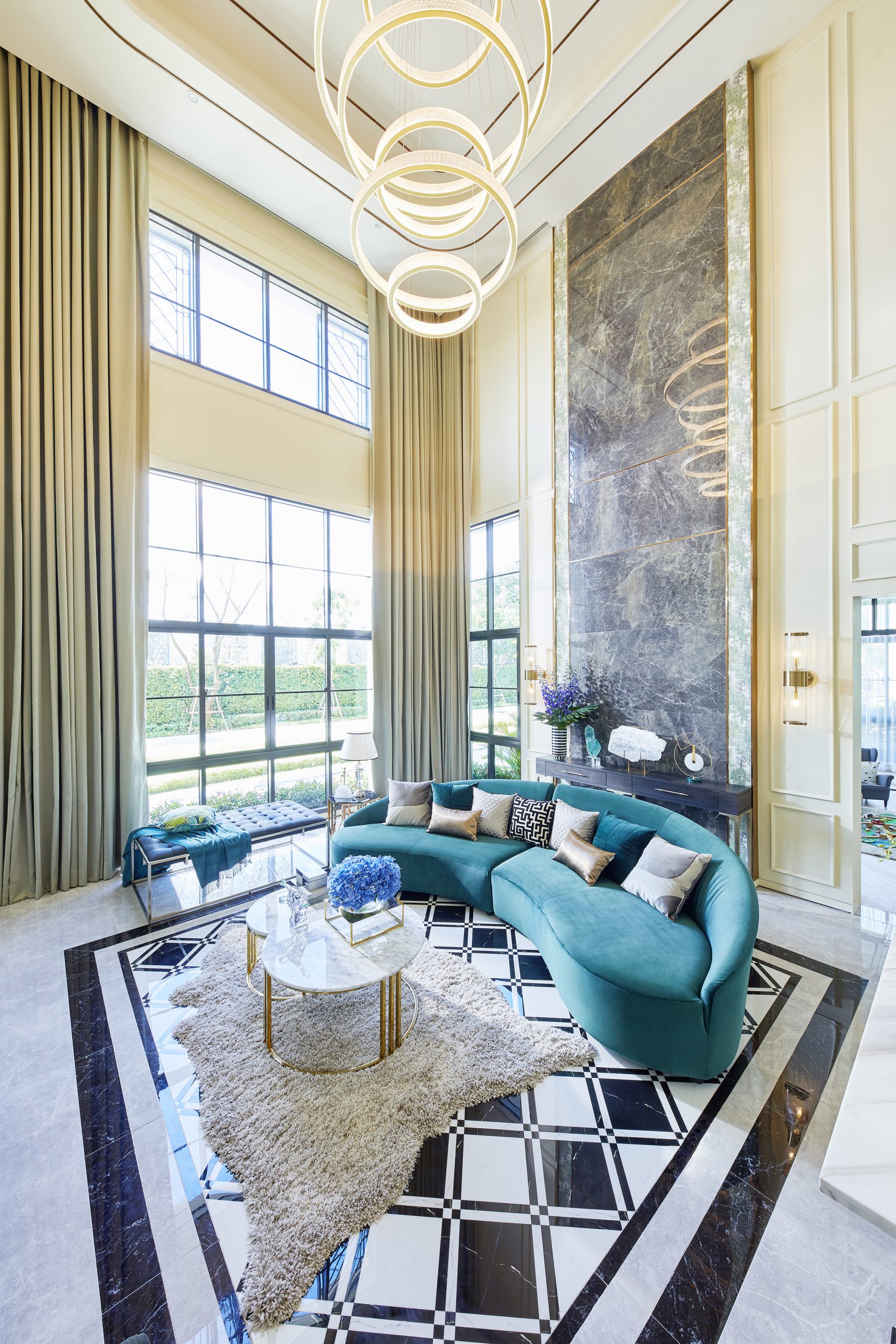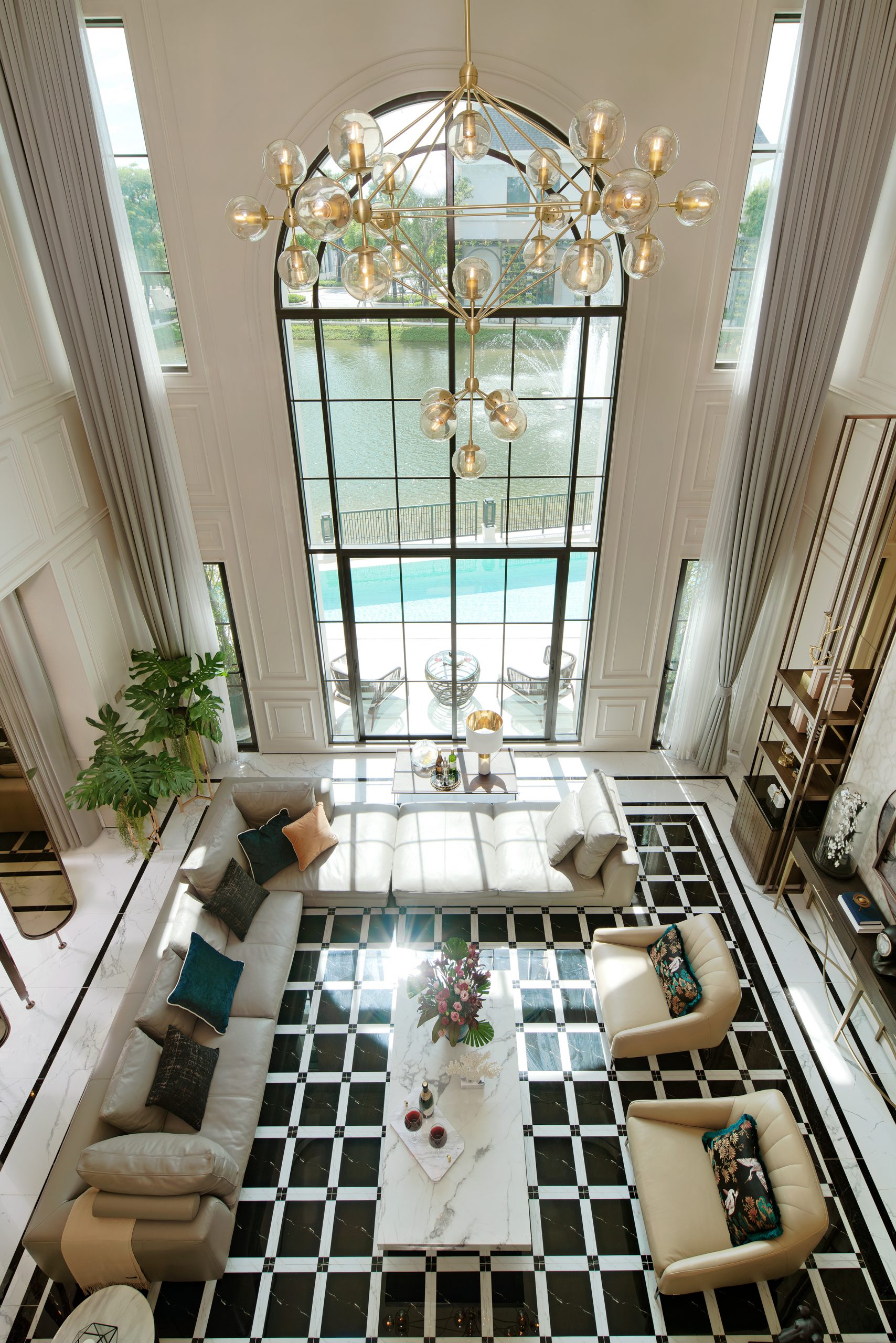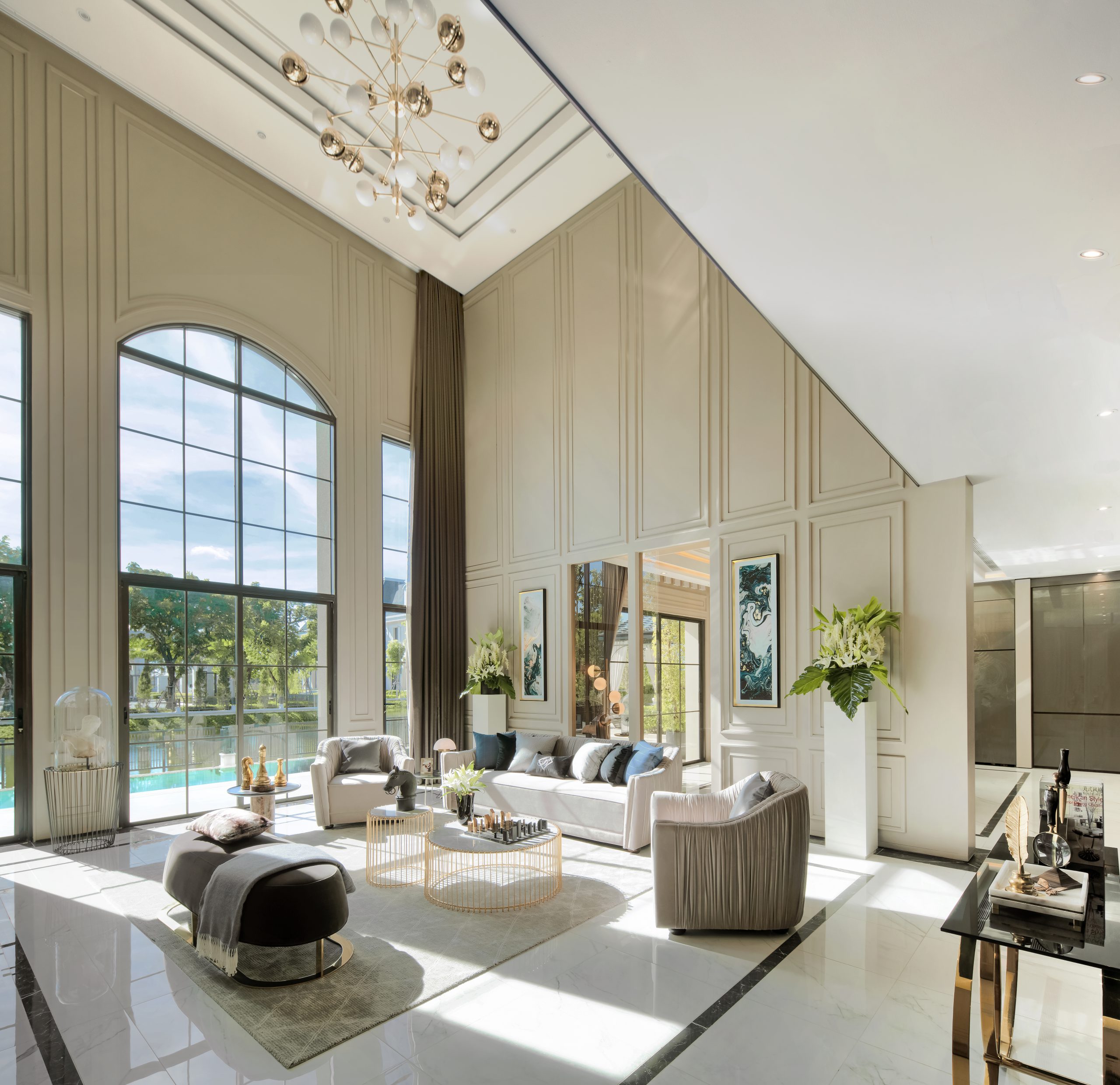 อีกจุดเด่นที่ต้องพูดถึงสำหรับพื้นที่ชั้นล่างก็คือตรงส่วนของ Living Area ที่ออกแบบให้เป็น Double Volume ความสูงถึง 6.9 เมตร เพิ่มความโอ่อ่า และสร้างการเชื่อมต่อระหว่างภายนอกกับภายในให้บรรยากาศที่โล่ง โปร่ง สบาย