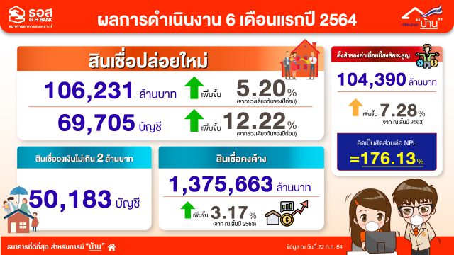 ทั้งนี้ ใน 6 เดือนแรกของปี 2564 ธนาคารปล่อยสินเชื่อใหม่ได้ 106,231 ล้านบาท 69,705 บัญชี เพิ่มขึ้น 5.20% จากช่วงเดียวกันของปี 2563 คิดเป็นเกือบ 50% ของเป้าหมายปล่อยสินเชื่อใหม่ปี 2564 ที่ 215,641 ล้านบาท โดยสินเชื่อ 6 เดือนแรกที่ปล่อยไปเป็นสินเชื่อที่มีวงเงินกู้ไม่เกิน 2 ล้านบาท สำหรับกลุ่มผู้มีรายได้น้อยและปานกลางจำนวน 50,183 บัญชี