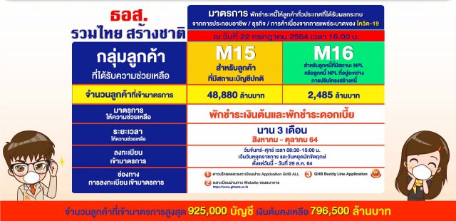 สำหรับมาตรการที่ 15 และ 16 ลูกค้าสามารถลงทะเบียนแจ้งความประสงค์เข้ามาตรการผ่าน Mobile Application : GHB ALL ได้ในวันจันทร์-ศุกร์ ระหว่างเวลา 8.30-15.00 น. (เว้นวันหยุดราชการและวันหยุดนักขัตฤกษ์) ตั้งแต่วันที่ 23 กรกฎาคม 2564 เป็นต้นไป จนถึงวันที่ 29 สิงหาคม 2564