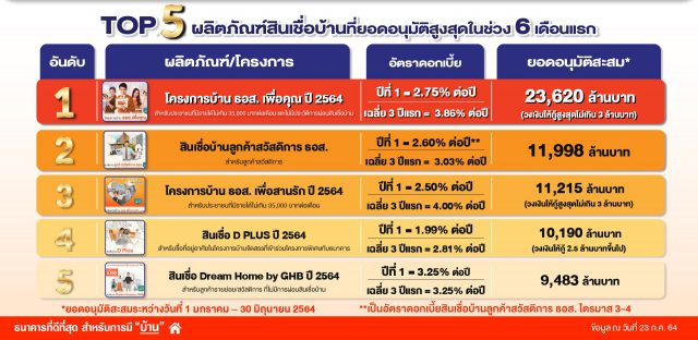 โครงการบ้าน ธอส. เพื่อคุณ อัตราดอกเบี้ยปีแรกเพียง 2.75% ต่อปี มียอดอนุมัติสะสมสูงถึง 23,620 ล้านบาท รองลงมาคือสินเชื่อบ้านลูกค้าสวัสดิการ ธอส. ปัจจุบันอัตราดอกเบี้ยปีแรก 2.60% ต่อปี มียอดอนุมัติสะสม 11,998 ล้านบาท และโครงการบ้าน ธอส. เพื่อสานรัก อัตราดอกเบี้ยปีแรก 2.50% ต่อปี มียอดอนุมัติสะสม 11,215 ล้านบาท