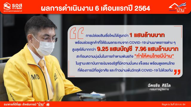 นายฉัตรชัย ศิริไล กรรมการผู้จัดการ ธนาคารอาคารสงเคราะห์ (ธอส.) เปิดเผยถึงผลการดำเนินงาน ณ ไตรมาสที่ 2 ของปี 2564 ว่า แม้ประเทศไทยจะยังคงอยู่ในสถานการณ์การแพร่ระบาดของเชื้อไวรัสโควิด-19 ที่ส่งผลต่อภาพรวมเศรษฐกิจ และรายได้ของประชาชน แต่ ธอส. ยังคงสามารถทำหน้าที่ตามพันธกิจ “ทำให้คนไทยมีบ้าน” เพื่อสนับสนุนให้ประชาชนได้มีที่อยู่อาศัยเป็นของตนเองได้อย่างต่อเนื่อง