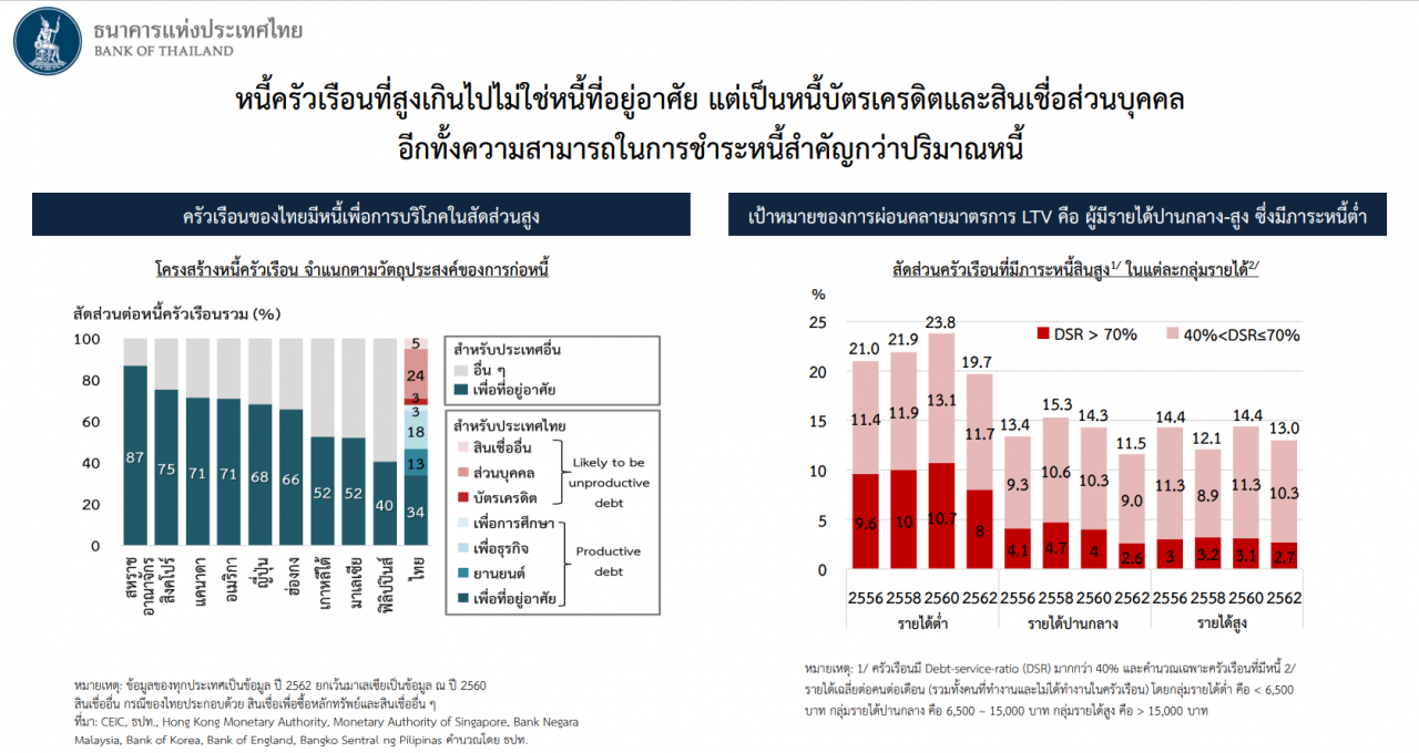 โดยเฉพาะจากกลุ่มที่ยังมีฐานะการเงินเข้มแข็งหรือรองรับการก่อหนี้เพิ่มได้ ผ่านการผ่อนคลายหลักเกณฑ์การกำกับดูแลสินเชื่อเพื่อที่อยู่อาศัยและสินเชื่ออื่นที่เกี่ยวเนื่องกับสินเชื่อเพื่อที่อยู่อาศัย (มาตรการ LTV) เป็นการชั่วคราว” นางรุ่ง มัลลิกะมาส ผู้ช่วยผู้ว่าการ สายนโยบายสถาบันการเงิน ธนาคารแห่งประเทศไทยกล่าว