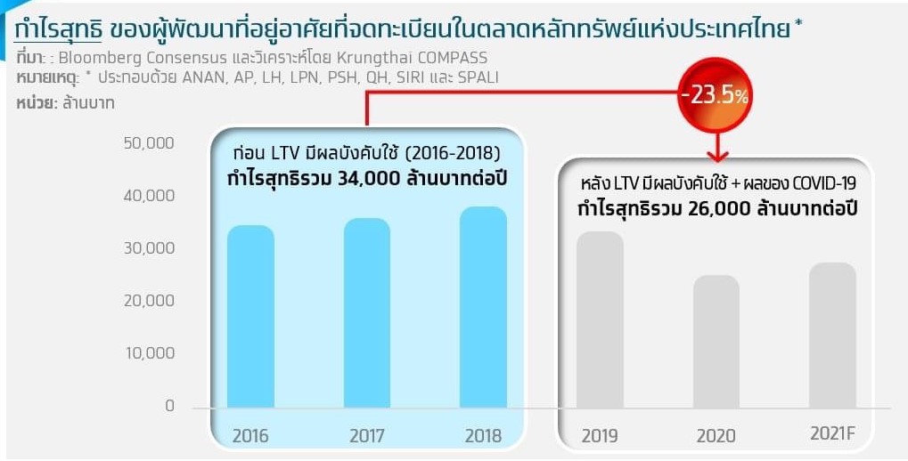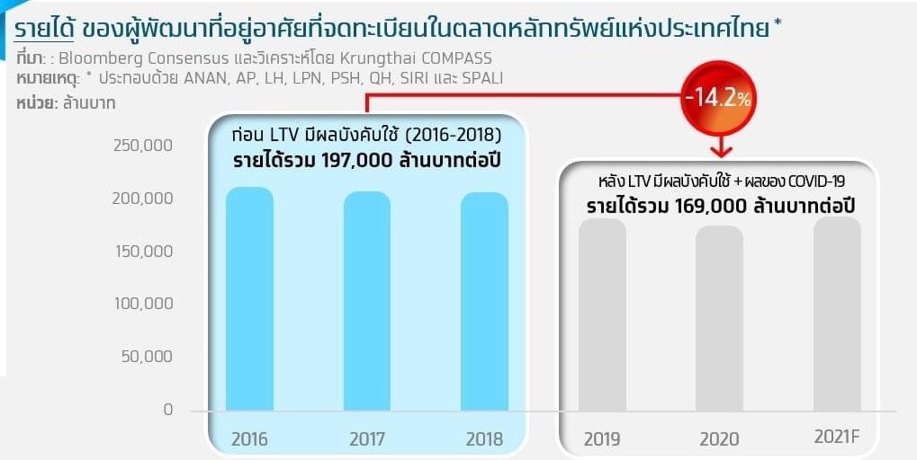 ศูนย์วิจัยธนาคารกรุงไทย หรือ Krungthai COMPASS คาดว่า สาเหตุสำคัญที่ทำให้ ธปท. ต้องผ่อนคลาย เนื่องจากตลาดที่อยู่อาศัยในปัจจุบันต้องเผชิญหน้ากับปัจจัยลบทั้ง 1) เกณฑ์ LTV และ 2) การแพร่ระบาดของโควิด-19 ส่งผลให้ผลประกอบการของผู้พัฒนาที่อยู่อาศัยหดตัวลงจากช่วงก่อนหน้าค่อนข้างมาก