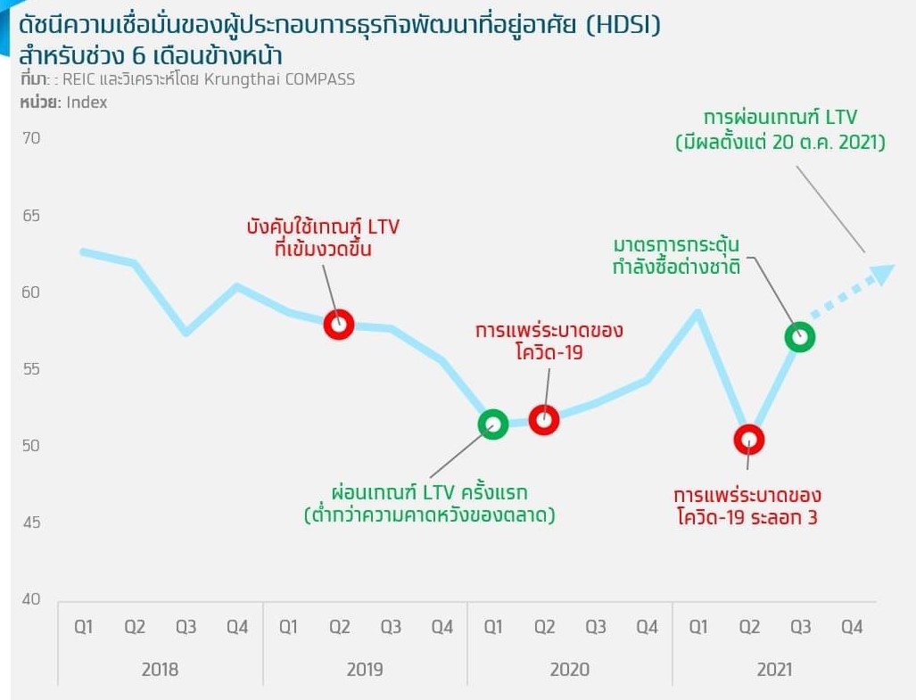 ประเด็นที่ 1 Sentiment ของตลาดที่อยู่อาศัยมีแนวโน้มที่จะปรับตัวไปในทิศทางที่ดีขึ้น โดยหากพิจารณาดัชนีความเชื่อมั่นของผู้ประกอบธุรกิจพัฒนาที่อยู่อาศัย(HDSI) สำหรับช่วง 6 เดือนข้างหน้า จะเห็นได้ว่าดัชนีดังกล่าวปรับตัวสูงขึ้นจาก 50.5 จุด ในไตรมาสที่ 2/2564 ขึ้นมาอยู่ที่ 57.2 จุดในไตรมาสที่ 3/2564 เป็นผลจากข่าวความคืบหน้าของมาตรการกระตุ้นกกำลังซื้ออสังหาฯ ของชาวต่างชาติ และสำหรับการผ่อนคลายเกณฑ์ LTV ในครั้งนี้ คาดว่าจะส่งเสริมให้ผู้ประกอบธุรกิจพัฒนาที่อยู่อาศัยมีความเชื่อมั่นในการดำเนินธุรกิจสูงขึ้นในไตรมาสที่ 4/2564