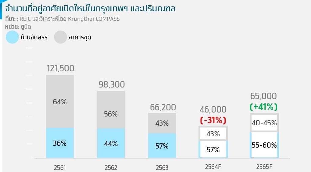 ทั้งนี้ คาดว่ายูนิตที่อยู่อาศัยเปิดใหม่ในปี 2565 จะอยู่ที่ 65,000 ยูนิต ปรับตัวสูงขึ้น 41% จากปี 2564 โดยส่วนใหญ่กว่า 55-60% ของยูนิตเปิดใหม่ทั้งหมดจะเน้นไปที่บ้านจัดสรรซึ่งสามารถก่อสร้างให้เสร็จภายในปีได้ (บ้านจัดสรรมักมีระยะเวลาก่อสร้างเฉลี่ย 3-6 เดือน) ซึ่งจะทำให้ผู้บริโภคได้รับประโยชน์จากการผ่อนคลายเกณฑ์ LTV ครั้งนี้มากที่สุด