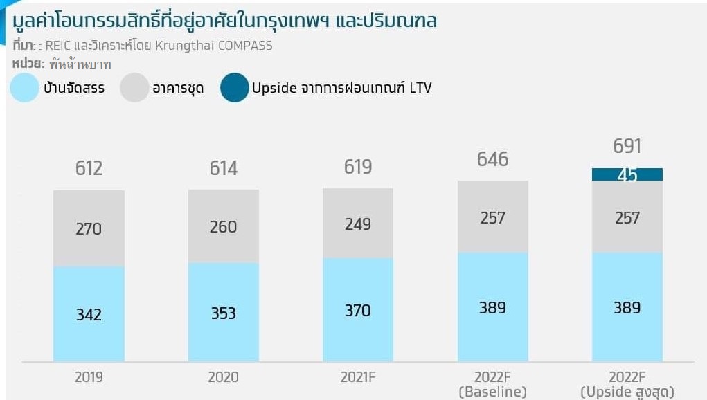 Krungthai COMPASS ประเมินว่า ตลาดที่อยู่อาศัยในปี 2565 จะได้รับประโยชน์ต่างๆ จากมาตรการภาครัฐ ทั้งมาตรการกระตุ้นกำลังซื้ออสังหาฯ ของชาวต่างชาติ และการผ่อนคลายเกณฑ์ LTV ของ ธปท.โดยคาดว่ามูลค่าโอนกรรมสิทธิ์ที่อยู่อาศัยในกรุงเทพฯ และปริมณฑลในปี 2565 มีโอกาสอยู่ที่ 646,000 ล้านบาท ในกรณี Baseline และอาจเพิ่มขึ้นได้สูงสุดเป็น 691,000 ล้านบาท จากการผ่อนคลายเกณฑ์ LTV