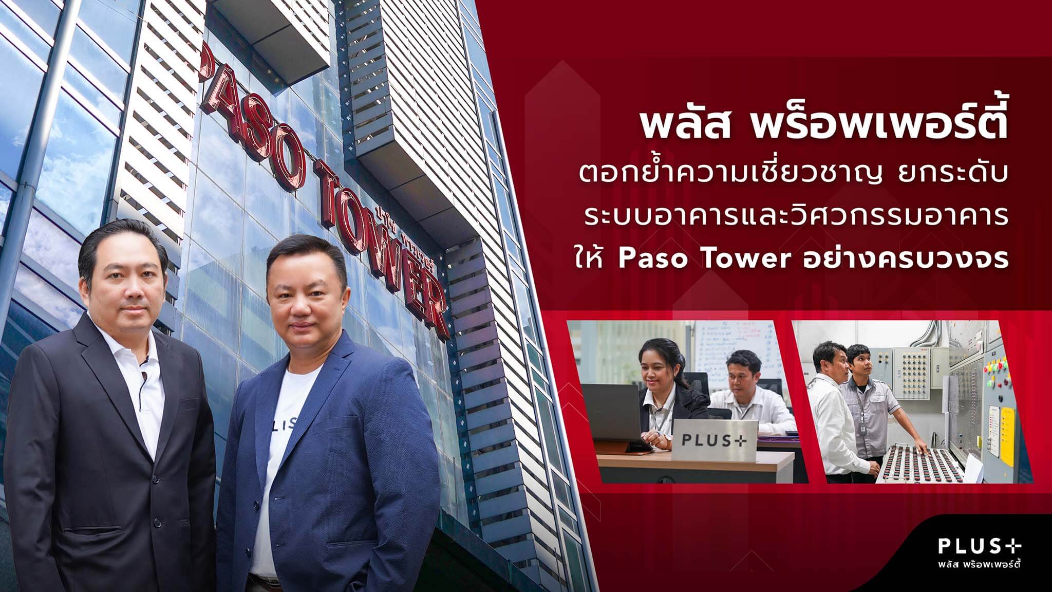อาคาร Paso Tower เป็นอาคารสำนักงานให้เช่าสูง 28 ชั้น ตั้งอยู่บนทำเลศักยภาพอย่างถนนสีลม การเดินทางสะดวกสบาย ใกล้รถไฟฟ้าบีทีเอสสถานีช่องนนทรี มีขนาดพื้นที่รวมทั้งหมด 28,860 ตร.ม. และพื้นที่สำนักงานให้เช่ารวม 11,143 ตร.ม. ทั้งนี้ พลัสฯ เข้ามาบริหารจัดการระบบอาคารและวิศวกรรมอาคารอย่างครบวงจรให้แก่ Paso Tower ครอบคลุมตั้งแต่การวางแผน ควบคุม และปฏิบัติการในการดูแลบำรุงรักษาระบบประกอบอาคาร ให้สามารถทำงานและใช้พลังงานได้อย่างมีประสิทธิภาพสูงสุด อาทิเช่น ระบบไฟฟ้า ระบบปรับอากาศ ระบบน้ำใช้ภายในอาคาร ระบบความปลอดภัยต่างๆ อย่างระบบป้องกันและระงับอัคคีภัย ระบบแจ้งเหตุเพลิงไหม้ หรือระบบอำนวยความสะดวก เช่น ลิฟต์ บันไดเลื่อน ผ่านการดำเนินงานโดยทีมงานผู้เชี่ยวชาญที่มีประสบการณ์กว่า 28 ปี และมีมาตรฐานในการดำเนินงานในระดับสากล พัฒนาทั้งความปลอดภัยและคุณภาพ เพื่อให้ Paso Tower สามารถรองรับการใช้งานได้อย่างต่อเนื่องและมีประสิทธิภาพยิ่งขึ้น