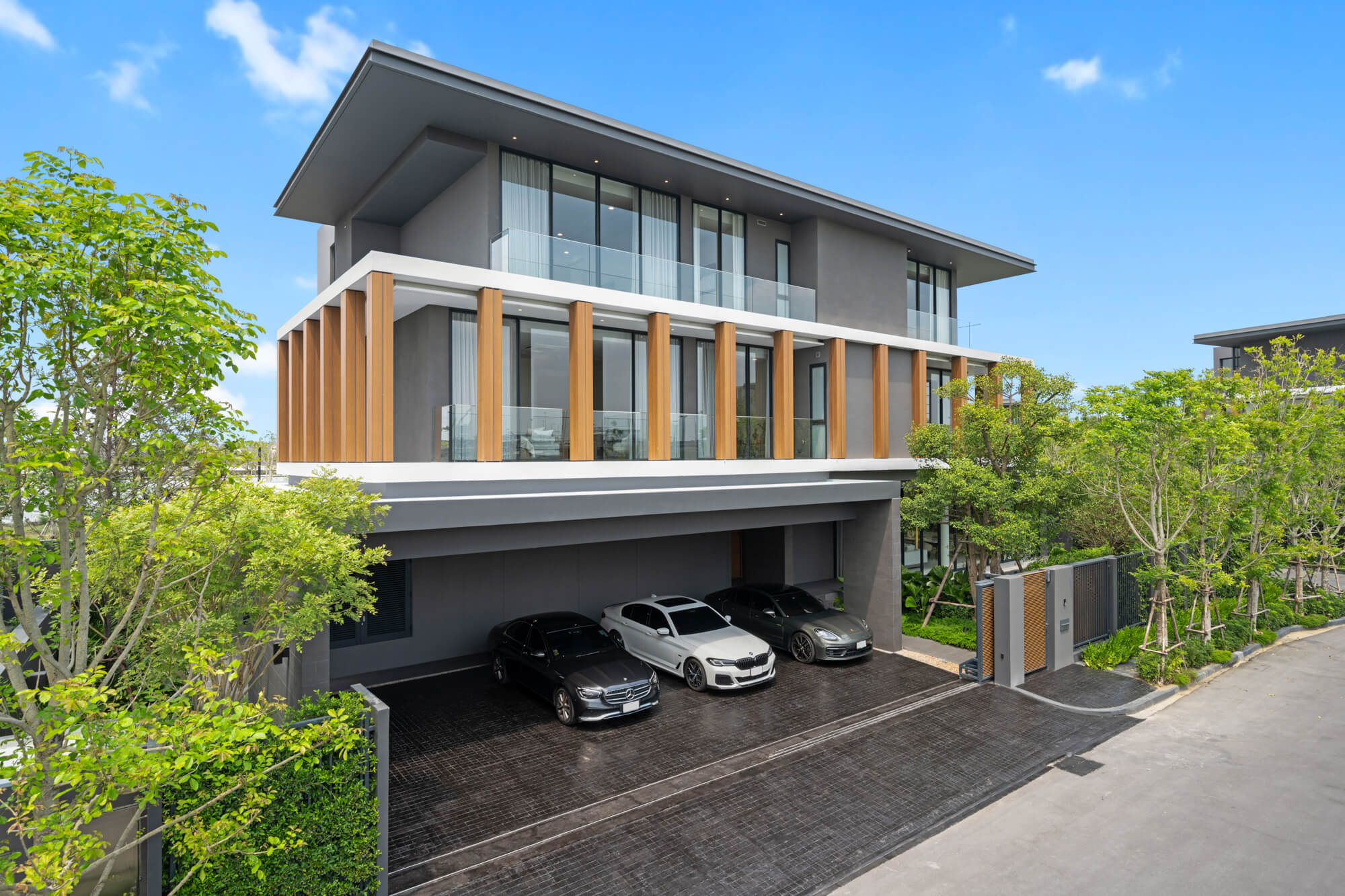 ขณะที่ภายนอกบ้าน มีการแยกโซนของสระว่ายน้ำ และสวน ที่ออกแบบให้สัมพันธ์กับรูปแบบของตัวอาคารหลัก มีการออกแบบพื้นที่ให้เป็นกรีนแอเรีย โอบล้อมด้วยต้นไม้ขนาบกับห้องลิฟวิ่งรูม จัดพื้นที่สวนให้สามารถเชื่อมต่อไปภายในบ้านได้ สามารถนั่งชิลมองธรรมชาติจากในบ้าน หรือ นั่งในสวน ในส่วนของต้นไม้ที่เลือกใช้เน้นไม้ใบสไตล์ทรอปิคอล เพื่อให้บ้านดูเป็นสวนที่ชุ่มชื่น ไม่รกจนเกินไป ดูแลรักษาง่าย โดยต้นไม้ที่เลือกใช้ในการตกแต่งประกอบด้วย ต้นล่ำซำ ต้นกันเกรา ปลูกไว้บริเวณสระว่ายน้ำ รวมถึงต้นปีบบริเวณโถงบันไดเพื่อให้ได้สัมผัสกลิ่นหอม ในราคา 155 ล้านบาท