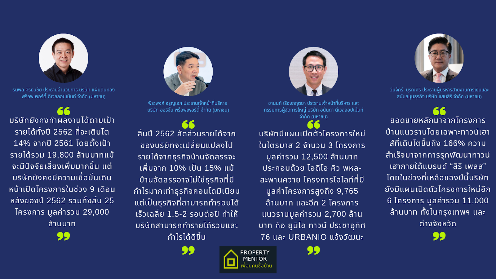 อันดับ 6.บริษัท พร็อพเพอร์ตี้ เพอร์เฟค จำกัด (มหาชน) มีรายได้รวม 5,689 ล้านบาท อันดับ 7 เป็นของ บริษัท แผ่นดินทอง พร็อพเพอร์ตี้ ดีเวลลอปเม้นท์ จำกัด (มหาชน) มีรายได้รวม 4,888 ล้านบาท อันดับ 8 บริษัท โนเบิล ดีเวลลอปเมนท์ จำกัด (มหาชน) มีรายได้รวม 3,691 ล้านบาท ตามมาติดๆ ด้วยอันดับ 9 บริษัท ควอลิตี้เฮ้าส์ จำกัด (มหาชน) และ 10 บริษัท ออริจิ้น พร็อพเพอร์ตี้ จำกัด (มหาชน) ที่มีรายได้รวม 3,498 ล้านบาท และ 3,453 ล้านบาท ตามลำดับ
