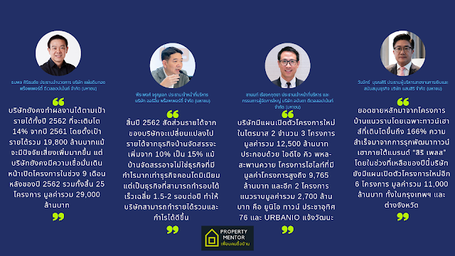 ถ้านับเฉพาะรายได้ที่เกิดจากการขายอสังหาริมทรัพย์ ในไตรมาส 1 บริษัทในตลาดหลักทรัพย์แห่งประเทศไทยรวมๆ กันกว่า 30 บริษัท มีรายได้จากการขายรวม 75,916 ล้านบาท เติบโตประมาณ 30% เช่นกัน เมื่อเทียบกับรายได้จากการขายในไตรมมาสแรกปี 2561 ที่มีจำนวน 58,304 ล้านบาท ขณะที่กำไรในไตรมาสแรกของปี 2562 อยู่ที่ 13,215 ล้านบาท เพิ่มขึ้นถึง 41% จากไตรมาสแรกปี 2561 ที่ทำกำไรได้ 9,372 ล้านบาท