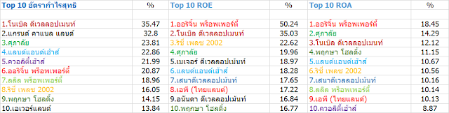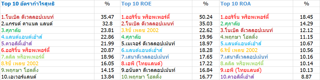 สำหรับอัตราส่วนผลตอบแทนต่อส่วนของผู้ถือหุ้น หรือ ROE (Retuon On Equity) อันดับ 1 ได้แก่ บริษัท ออริจิ้น พร็อพเพอร์ตี้ มี ROE สูงถึง 50.24% อันดับ 2 บริษัท โนเบิล ดีเวลลอปเมนท์ 35.03% อันดับ 3 บริษัท ริชี่ เพลซ 2002 ROE 22.62% อันดับ 4 บริษัท ศุภาลัย ROE 19.96% และอันดับ 5 บริษัท เมเจอร์ ดีเวลลอปเม้นท์ ROE 18.97%