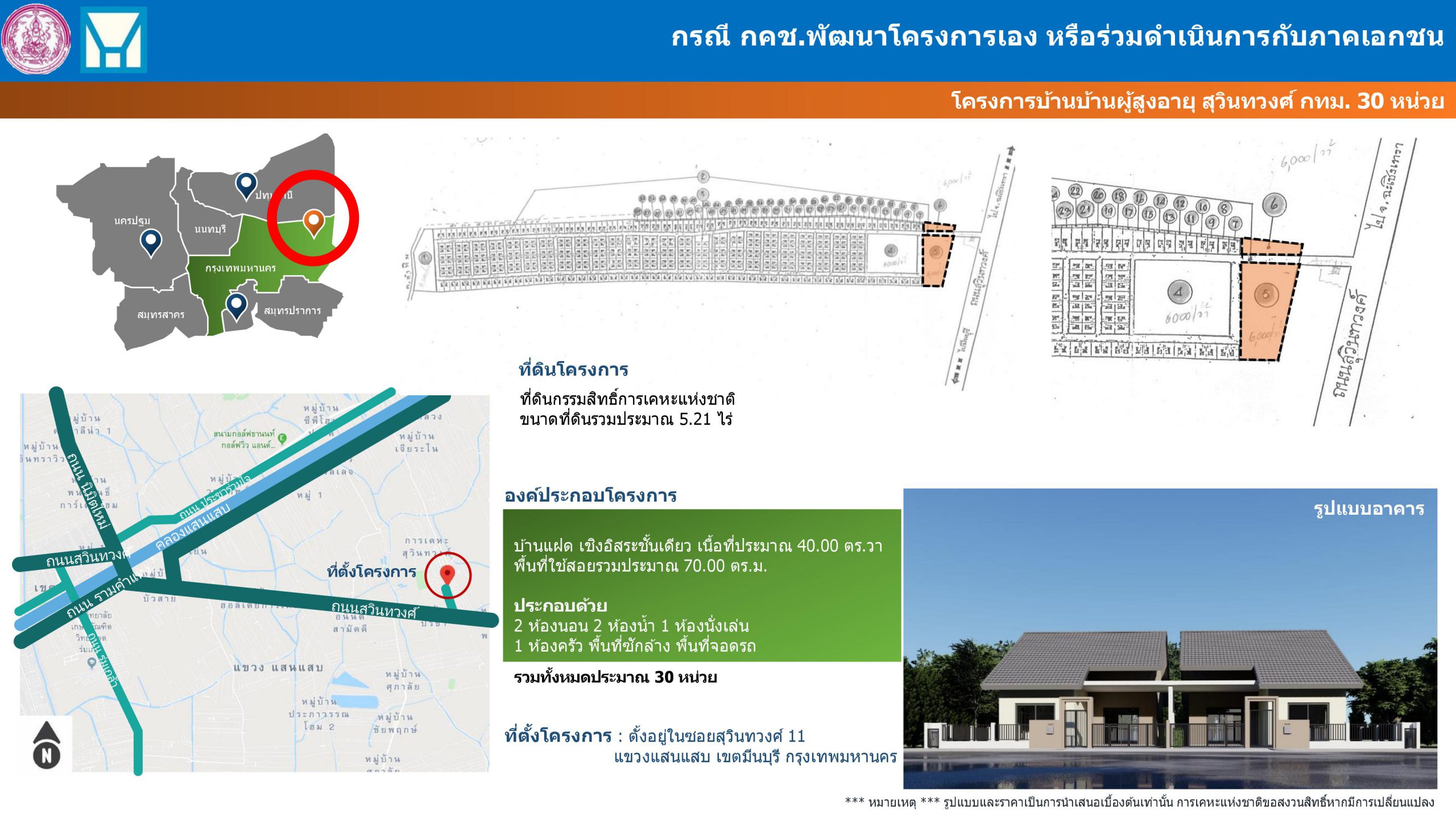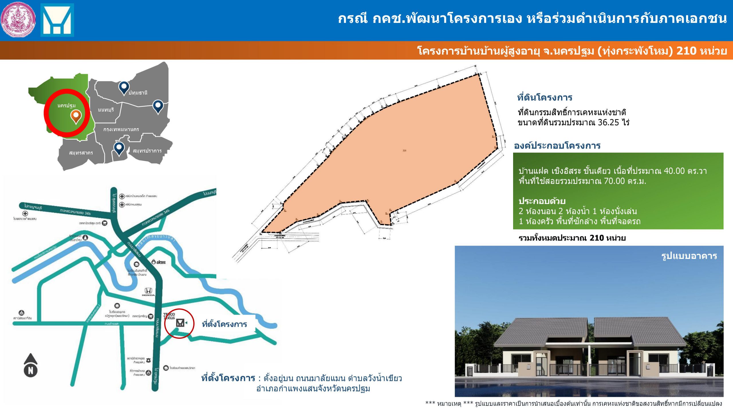 ล่าสุดการเคหะแห่งชาติได้ออกแบบบ้านเดี่ยวชั้นเดียวในลักษณะ Universal Design อาศัยอยู่ร่วมกันได้ทุกช่วงวัย ขนาดเนื้อที่ 20 ตารางวา มี 3 รูปแบบ ได้แก่ พื้นที่ใช้สอยประมาณ 22, 28 และ 36 ตารางเมตร โดยจัดสร้างบ้านตัวอย่างที่บริเวณด้านหน้าสนามกีฬาคลองจั่น เขตบางกะปิ กรุงเทพฯ ให้ผู้สนใจสามารถเข้าชมได้ในวันและเวลาราชการ และขณะนี้อยู่ระหว่างการพิจารณาพื้นที่ที่จะดำเนินการก่อสร้างในอนาคต โดยตั้งใจว่าจะเปิดโครงการนำร่องใน 4 มุมเมืองในพื้นที่กทม.และปริมณฑลจำนวน 4 โครงการ และ อีก 4 โครงการในภูมิภาค