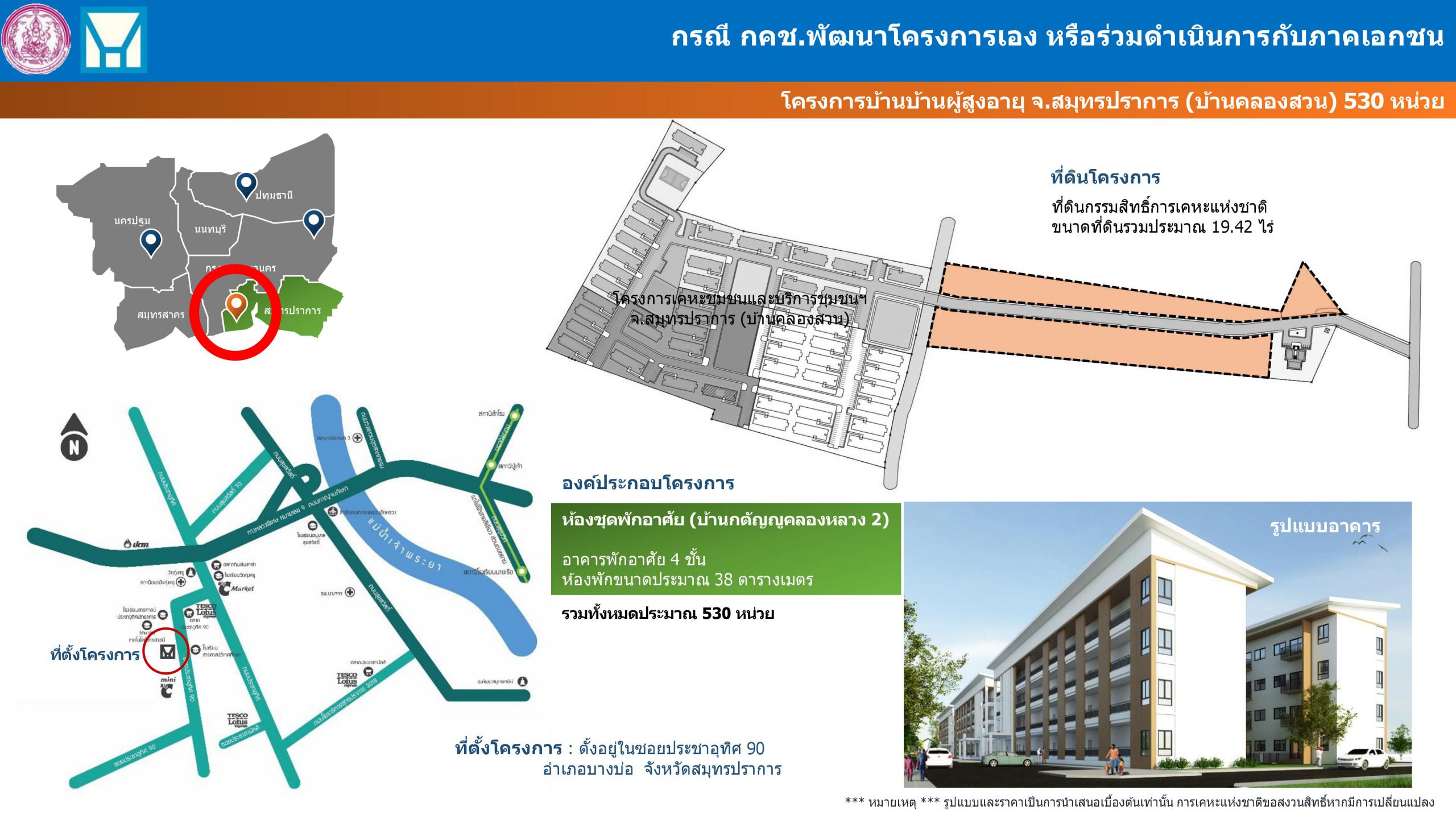 ขณะเดียวกันการเคหะแห่งชาติยังให้ความสำคัญกับผู้สูงอายุตามนโยบายของกระทรวงการพัฒนาสังคมและความมั่นคงของมนุษย์ โดยจะดำเนินการจัดสร้าง โครงการที่อยู่อาศัยสำหรับผู้สูงอายุ 4 มุมเมือง (กรุงเทพฯ และปริมณฑล) พร้อมสิ่งอำนวยความสะดวกสำหรับผู้สูงอายุ โดยการเคหะแห่งชาติจะพัฒนาโครงการเอง หรือร่วมดำเนินการกับภาคเอกชน (Joint Operation) ซึ่งได้พิจารณาพื้นที่เป้าหมาย 4 พื้นที่ ได้แก่ โครงการบ้านกตัญญูคลองหลวง 1 และ 2 จังหวัดปทุมธานี 360 หน่วย โครงการบ้านผู้สูงอายุ จังหวัดนครปฐม (ทุ่งกระพังโหม) จำนวน 210 หน่วย โครงการบ้านผู้สูงอายุ สุวินทวงศ์ กรุงเทพฯ จำนวน 30 หน่วย และโครงการบ้านผู้สูงอายุ จังหวัดสมุทราปราการ (บ้านคลองสวน) จำนวน 530 หน่วย รวมถึงเปิดโอกาสให้เอกชนสัมปทานโครงการที่อยู่อาศัยของการเคหะแห่งชาติ และนำอาคารมาปรับปรุงรองรับการอยู่อาศัยของผู้สูงอายุ รวมทั้งบริหารจัดการดูแลผู้สูงอายุแบบเบ็ดเสร็จ ภายใต้เงื่อนไขของการเคหะแห่งชาติกำหนดร่วมกับภาคีที่เกี่ยวข้อง