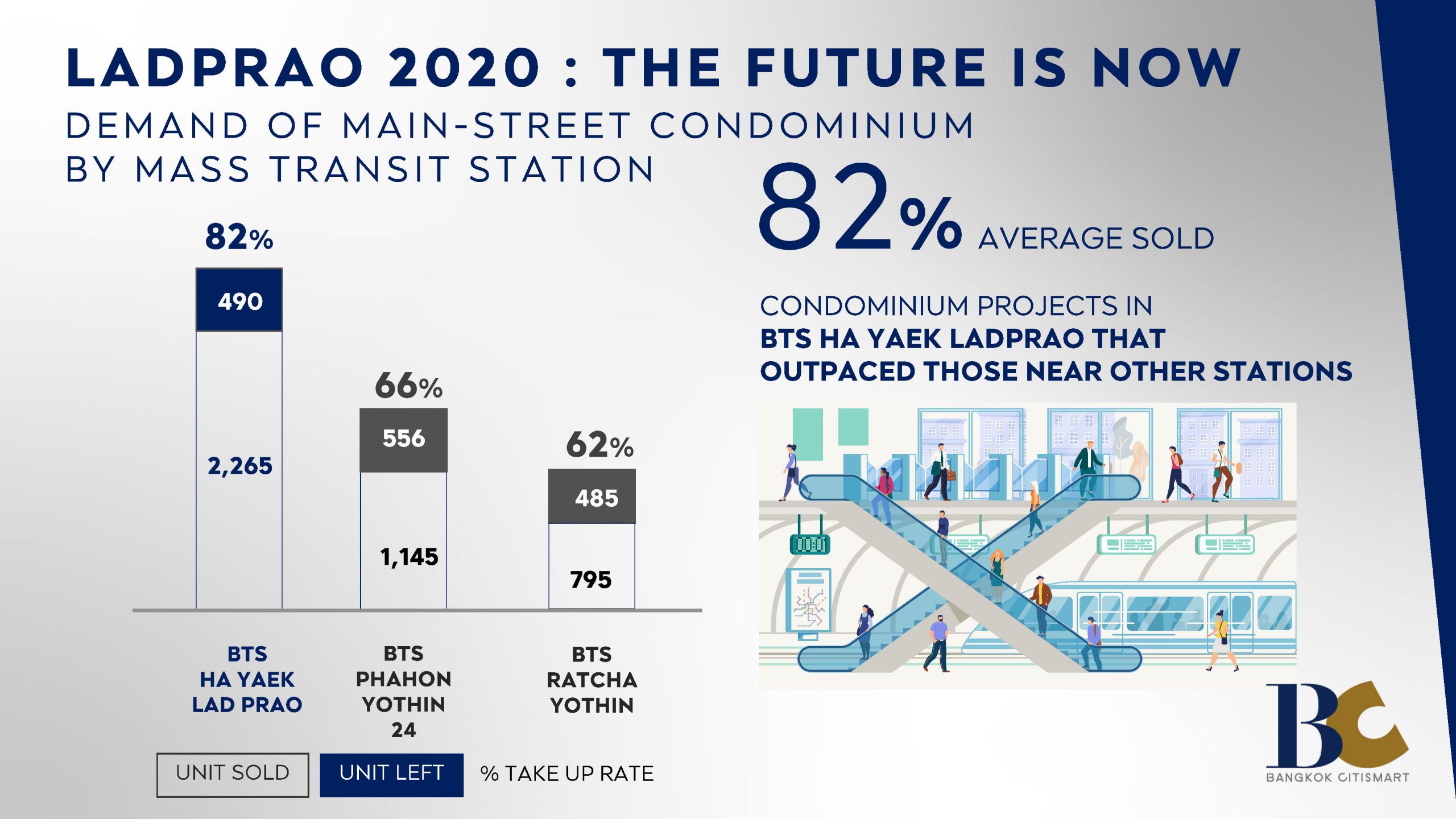 และหากเจาะข้อมูลดีมานด์ในแต่ละสถานีจะพบว่า สถานีที่ได้รับความนิยมสูงสุดคือ สถานีบีทีเอสห้าแยกลาดพร้าวที่มีอัตราการตอบรับที่ดีที่สุด โดยมียอดขายรวมกว่า 82% มียูนิตคงเหลือขายประมาณ 490 ยูนิตเท่านั้น เพราะเป็นทำเลที่ดีที่สุดเปรียบเสมือนศูนย์กลางของย่าน