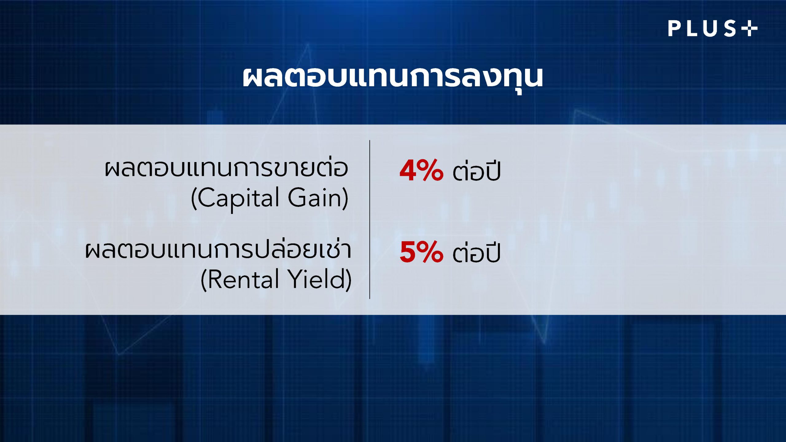 • ด้านผลตอบแทนการลงทุน พบว่า มีผลตอบแทนการขายต่อ (Capital Gain) 4% และผลตอบแทนการปล่อยเช่า (Rental Yield) 5% ต่อปี จึงเป็นทำเลที่เหมาะกับทั้งเรียลดีมานด์และการลงทุนในระยะยาว