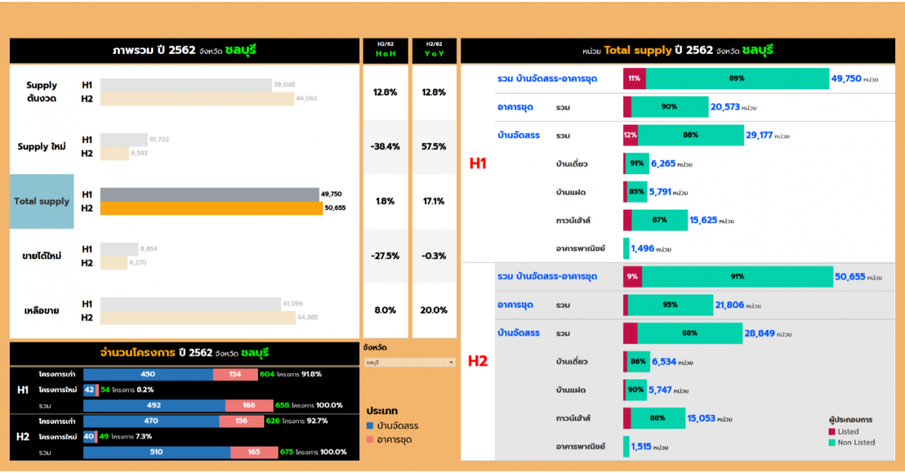 สำหรับตลาดที่อยู่อาศัยในพื้นที่จังหวัดชลบุรี พบว่า ณ สิ้นปี 2562 มีจำนวนที่อยู่อาศัยที่อยู่ระหว่างเสนอขายจำนวนทั้งสิ้น 675 โครงการ จำนวน 50,655 หน่วย คิดเป็นมูลค่า 176,116 ล้านบาท เพิ่มขึ้นจากช่วงครึ่งปีแรกร้อยละ 1.8 โดยมีโครงการที่เปิดขายใหม่ในช่วงครึ่งปีหลังเพียง 6,593 หน่วย แบ่งเป็น อาคารชุด 3,700 หน่วย และบ้านจัดสรร 2,893 หน่วย