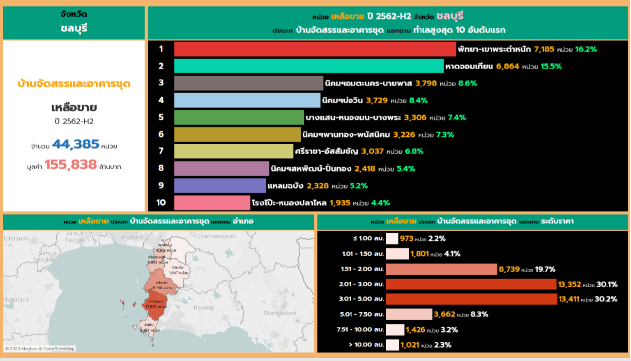 จากการที่จำนวนหน่วยขายได้ใหม่มีอัตราการขายได้ลดลงถึงร้อยละ 27.5 จึงส่งผลให้จำนวนที่อยู่อาศัยเหลือขายในจังหวัดชลบุรีมีอัตราเพิ่มขึ้นร้อยละ 8 โดยทำเลที่มีที่อยู่อาศัยเหลือขายมากที่สุด 5 อันดับแรก ได้แก่ 1.ทำเลพัทยา-เขาพระตำหนัก จำนวน 7,185 หน่วย 2.ทำเลหาดจอมเทียน จำนวน 6,864 หน่วย 3.ทำเลนิคมอุตสาหกรรมอมตะนคร-บายพาส จำนวน 3,798 หน่วย 4. ทำเลนิคมอุตสาหกรรมบ่อวิน จำนวน 3,729 หน่วย และ 5.ทำเลบางแสน-หนองมน-บางพระ จำนวน 3,306 หน่วย”