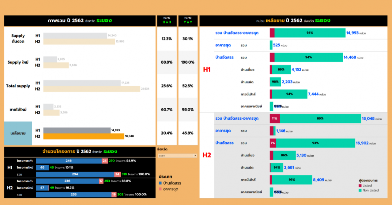 สำหรับภาพรวมโครงการที่อยู่อาศัยในจังหวัดระยอง ซึ่งเป็นพื้นที่ที่มีความสำคัญในลำดับรองลงมาใน EEC ภาพรวมโครงการที่อยู่อาศัยจังหวัดระยองในครึ่งหลังปี 2562 อุปทานภาพรวมมีที่อยู่อาศัยเสนอขายจำนวน 302 โครงการ รวม 21,634 หน่วย รวม มีโครงการที่ขายได้ใหม่ในช่วงครึ่งปีหลังจำนวน 3,586 หน่วย และมีหน่วยเหลือขายจำนวน 18,048 หน่วย มูลค่า 45,221 ล้านบาท