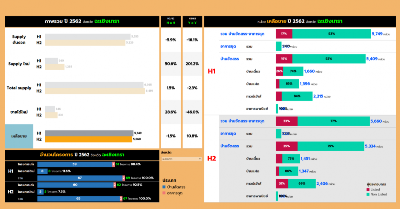 สำหรับภาพรวมโครงการที่อยู่อาศัยจังหวัดฉะเชิงเทรา จากการสำรวจพบว่า ในครึ่งหลังปี 2562 อุปทานภาพรวมมีที่อยู่อาศัยเสนอขายจำนวน 67 โครงการ รวม 6,491หน่วย มีโครงการขายได้ใหม่จำนวน 831 หน่วย และมีหน่วยเหลือขาย 5,660 หน่วย คิดเป็นมูลค่าหน่วยเหลือขาย 16,500 ล้านบาท แบ่งเป็นโครงการบ้านจัดสรร จำนวน 5,334 หน่วยมีมูลค่า 16,164 ล้านบาท โครงการอาคารชุด มีจำนวน 326 หน่วย มีมูลค่า 336 ล้านบาท
