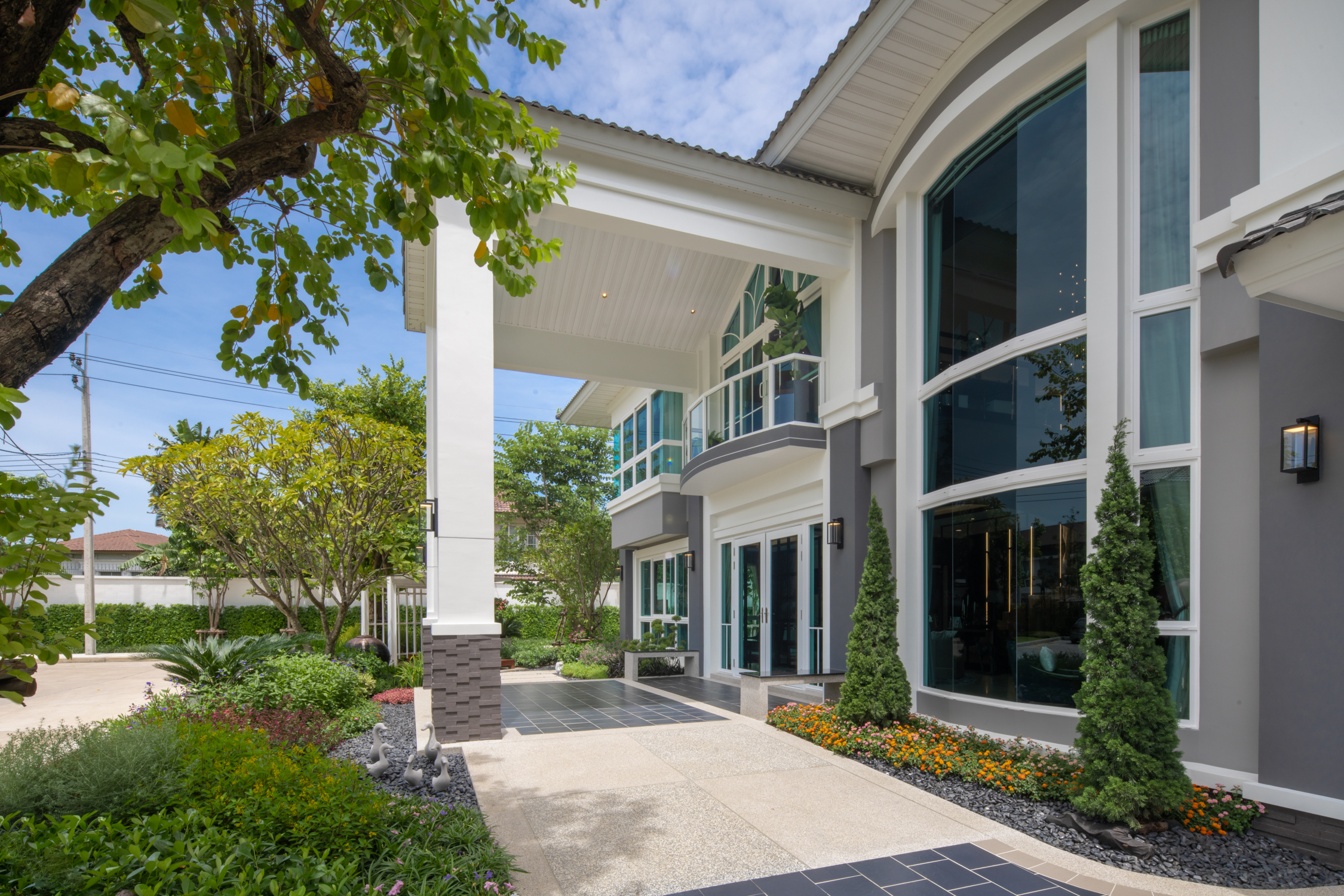 - Prestige ด้วยการออกแบบบ้านหลังใหญ่ให้โอ่โถง สง่างาม ทั้งภายในและภายนอก ในสไตล์ Modern Contemporary ที่เน้นความโปร่ง มี Canopy Porch ที่บริเวณทางเข้าบ้านสำหรับ Drop off และเพิ่มความสง่างามให้กับตัวบ้าน ห้องรับแขกออกแบบให้โอ่โถงด้วย Double Volume สูง 6 เมตร โถงบันไดโค้งมนที่เพิ่มความหรูหราภายในบ้าน และช่องหน้าต่างที่เป็นกระจกเต็มบานตั้งแต่พื้นจดเพดานเชื่อมต่อบรรยากาศภายนอกสู่ภายใน